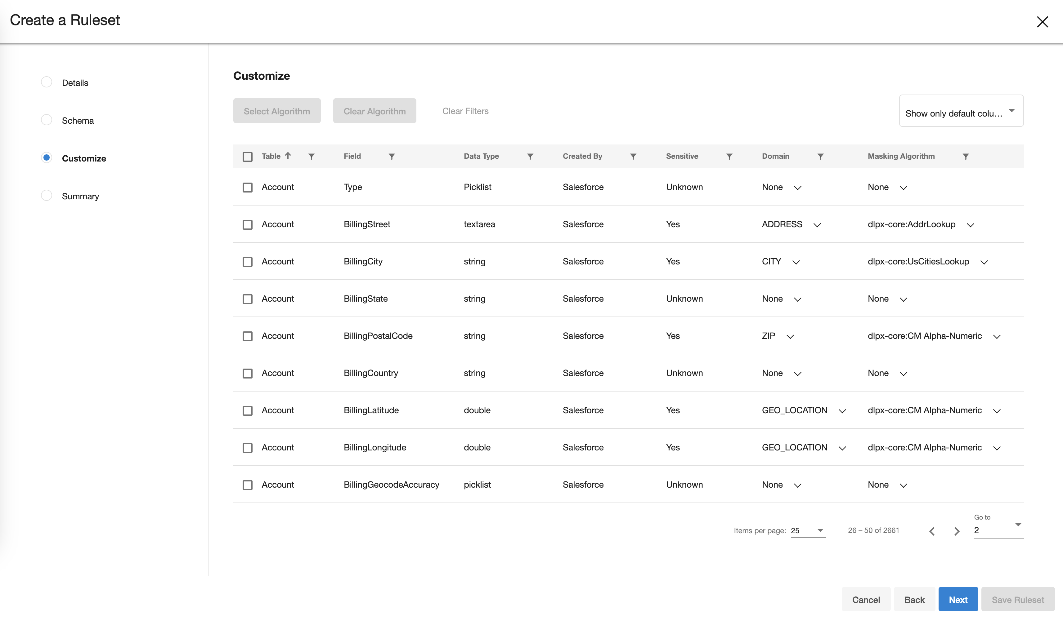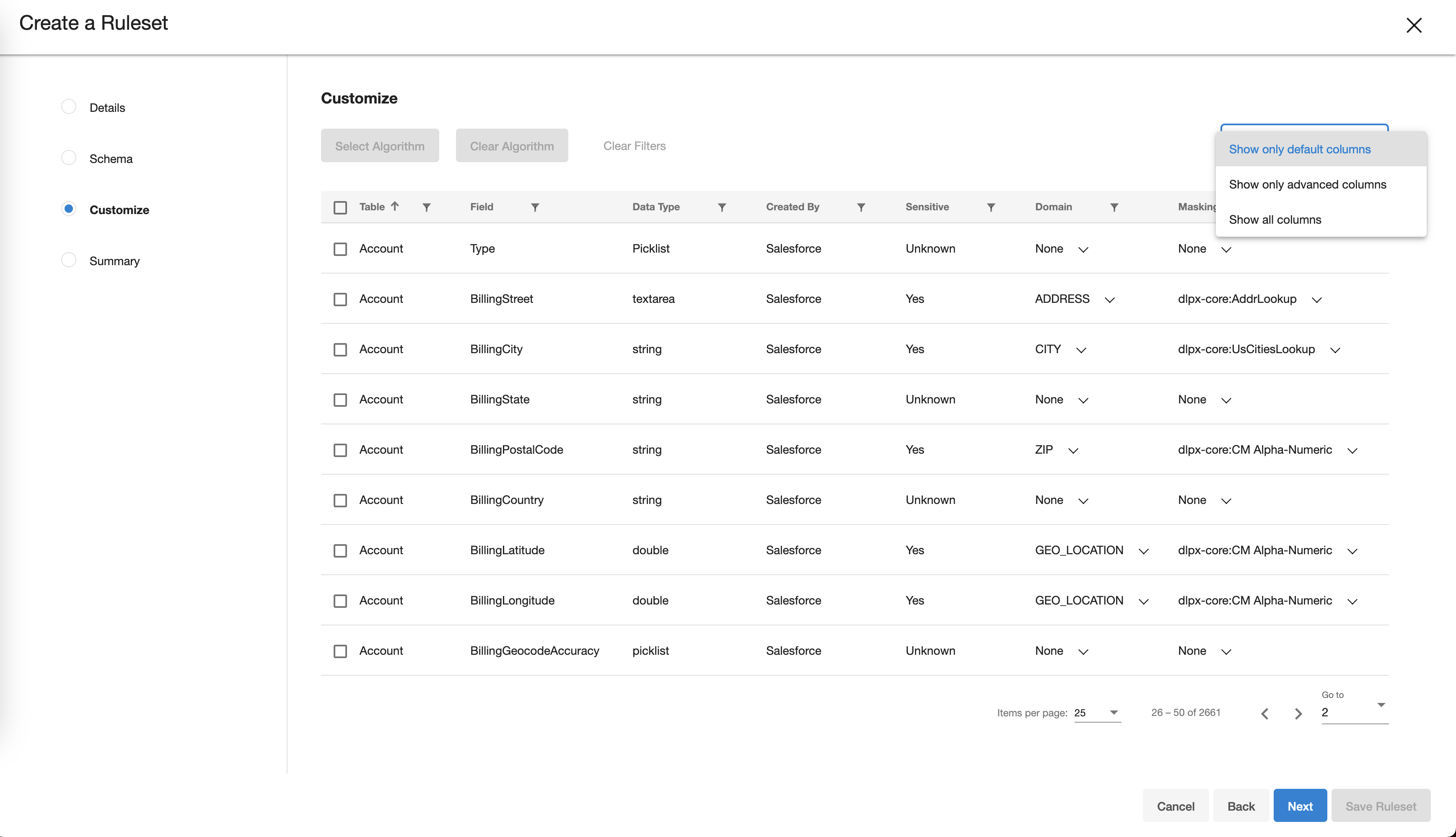 The “show all columns” option shows all columns.Use the Data Type information present in the Ruleset to help identify which domains and algorithms may be applicable to the underlying data.