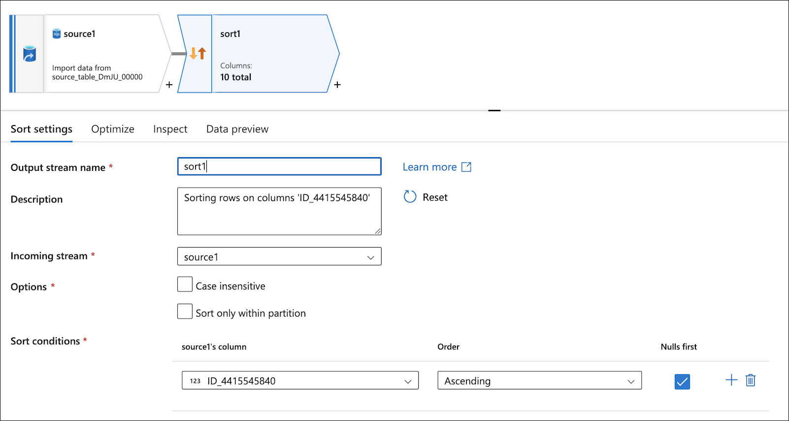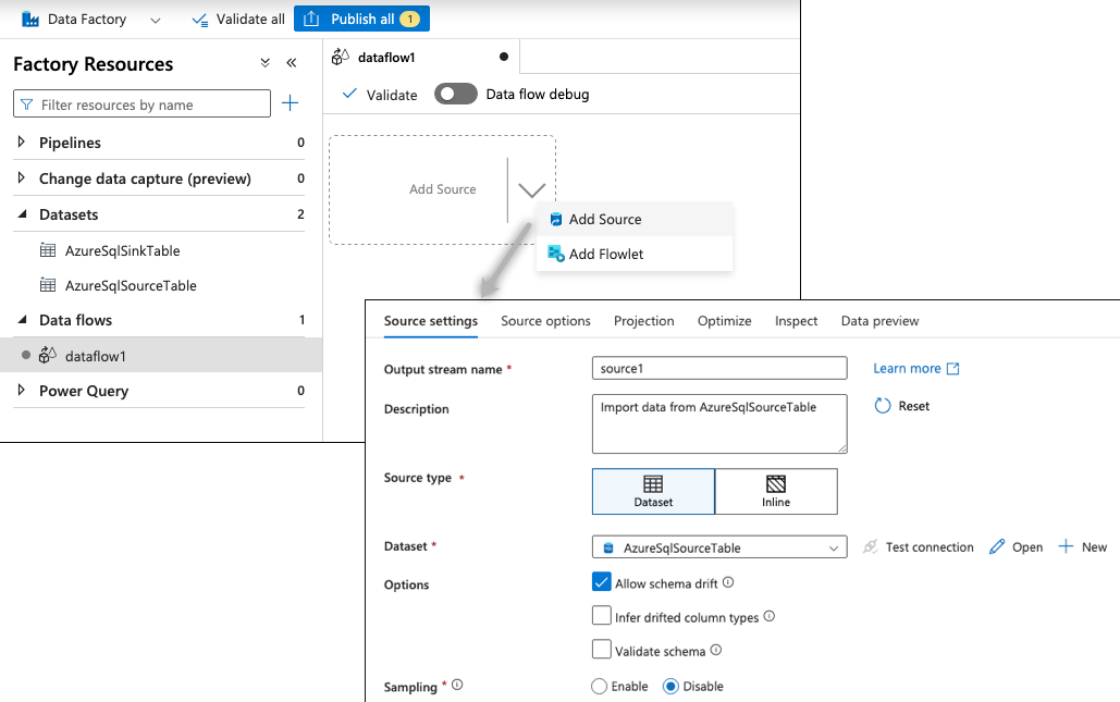 Under the dataflow tab, select Add Source to add the data source and set the dataset as the source dataset that was previously added.