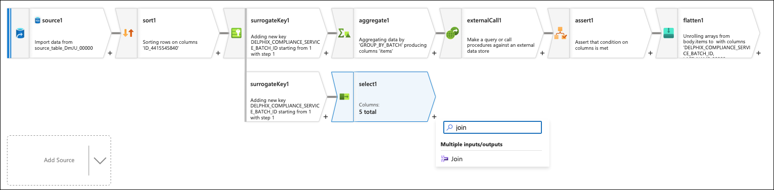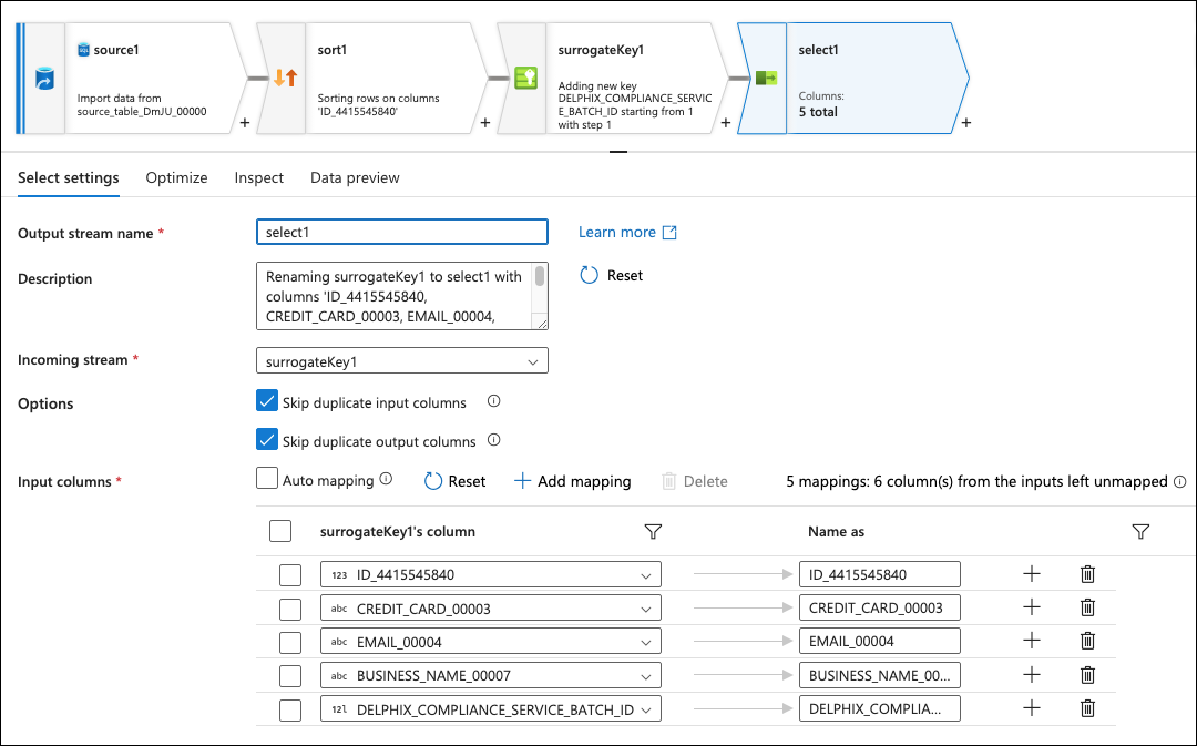 In the Select settings, delete the two columns that were joined with the names <flow step>@DELPHIX_COMPLIANCE_SERVICE_BATCH_ID. This is not always needed, but depends if the write out to the sink has issues with extra columns. For easier debugging, the order of the columns can also be modified to match the original source’s column ordering.