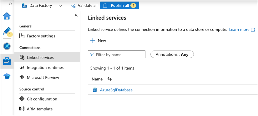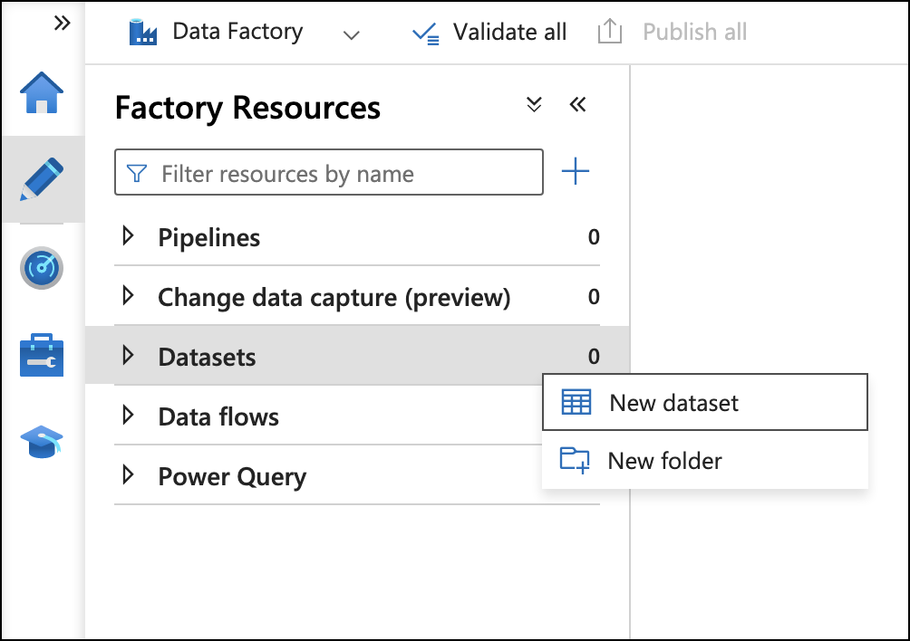 Click the pencil icon to access the Author page. For both source and sink databases, use the steps in the Create data factory section to add them to the data factory. Navigate to Datasets → New dataset.