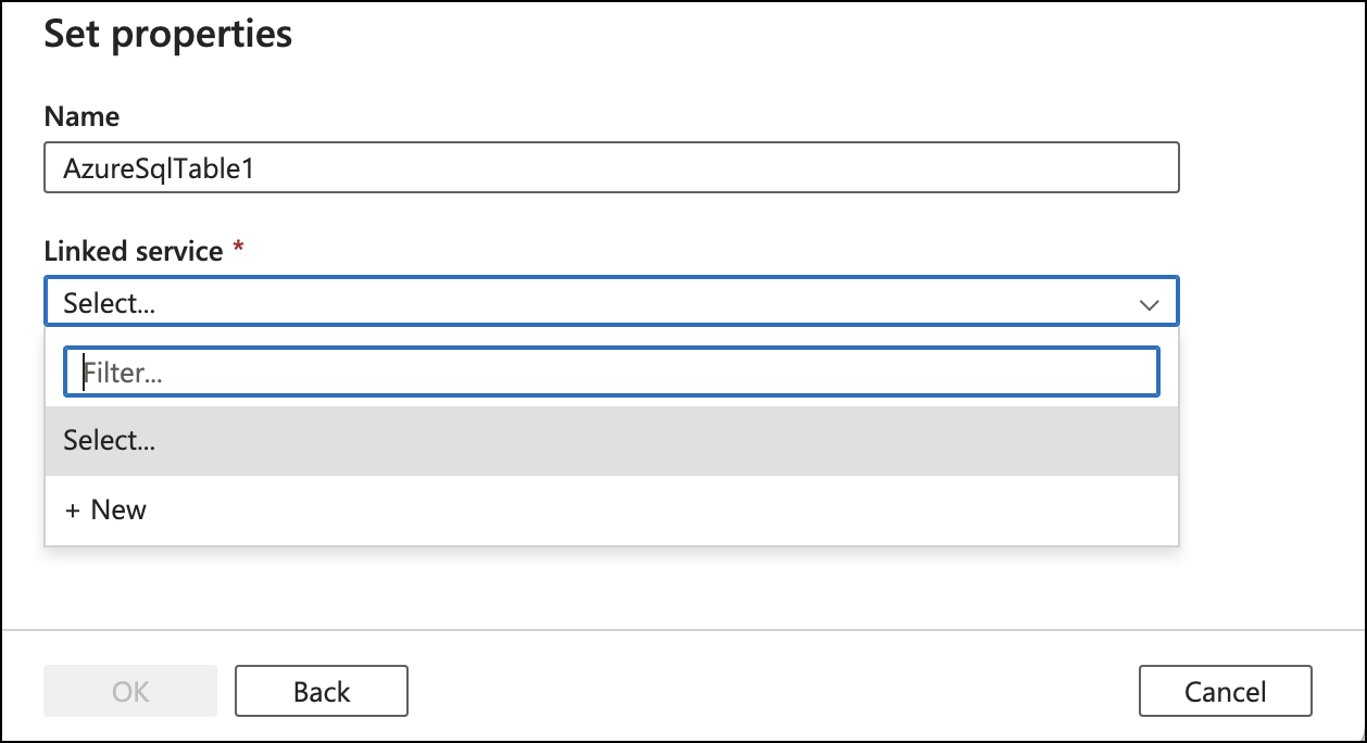 Click on the source or sink database type. In the Set properties window for adding the database, set the Name and add a new Linked service.