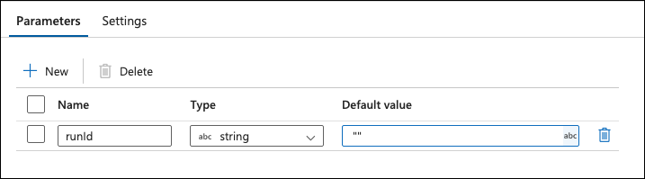 On the Parameters setting for the new data flow, click + New and set Name to runId and Default value to "".