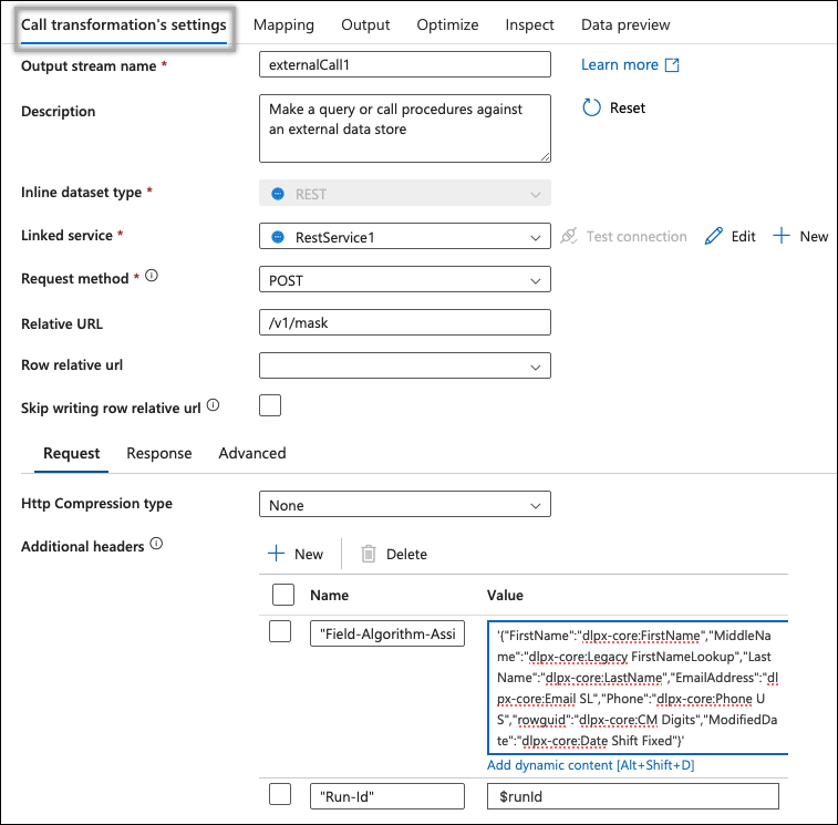 On the flow’s Call transformation settings page, select the REST service that was created previously that points to the Azure DCS endpoint.