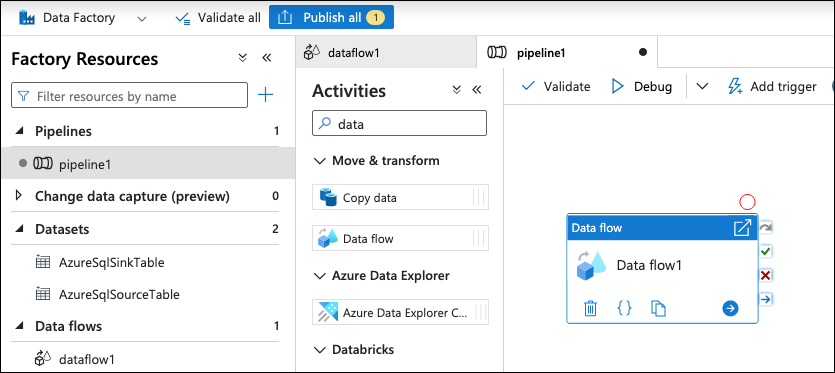 Navigate to on Pipelines > New pipeline. Under the Activities section, search for "Data flow" (under "Move & transform") and drag it to the page.