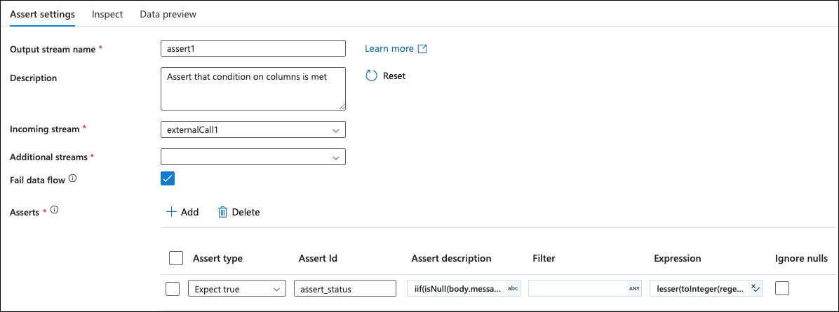 Enable Fail data flow and then in the first Asserts row, set the values as follows: