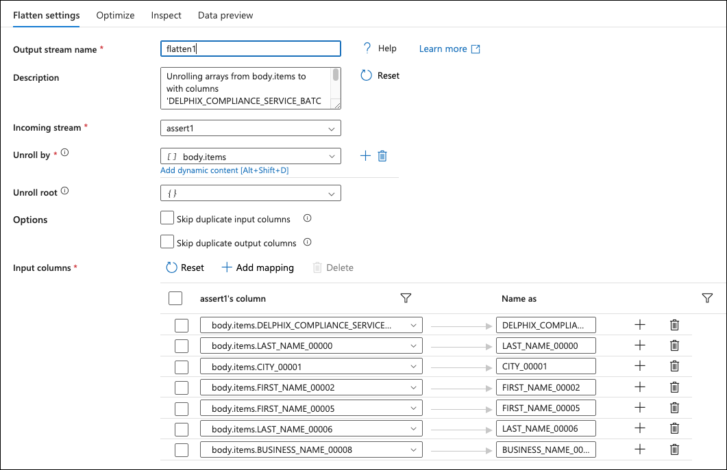 Set the Unroll by to body.items in the Flatten settings, then for the Input columns, add all the body.item columns that are coming back from the external call. These will be all the masked values with the surrogate key. It may be easier to click the reset button and delete unneeded columns.