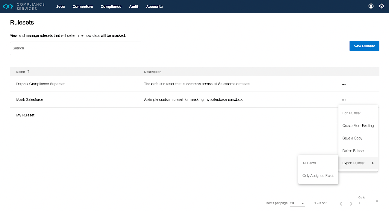 Delphix Compliance Services offers powerful and intuitive capabilities to edit, search, and filter rulesets in the UI. Rulesets can be exported so that users can edit rulesets in a tool of choice. This feature will enable some of the following benefits.